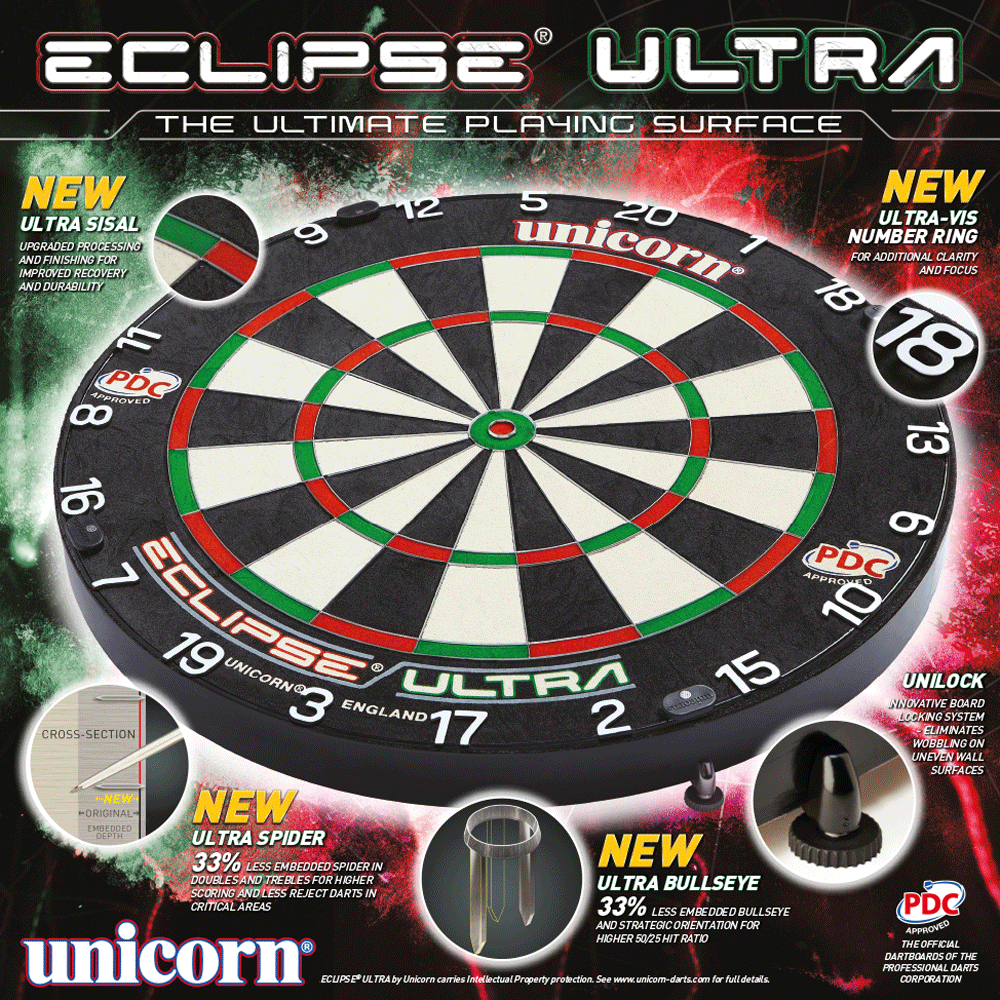 Rewolucyjna tarcza Eclipse Ultra to produkt legendarnej firmy Unicorn na 2022 rok. Absolutnie najnowszy model, świeżo sprawdzony na turnieju World Grand Prix, na którym zaprezentowała się fenomenalnie. Grają na niej najlepsi darterzy na świecie, a teraz tę tarczę możesz mieć i Ty.