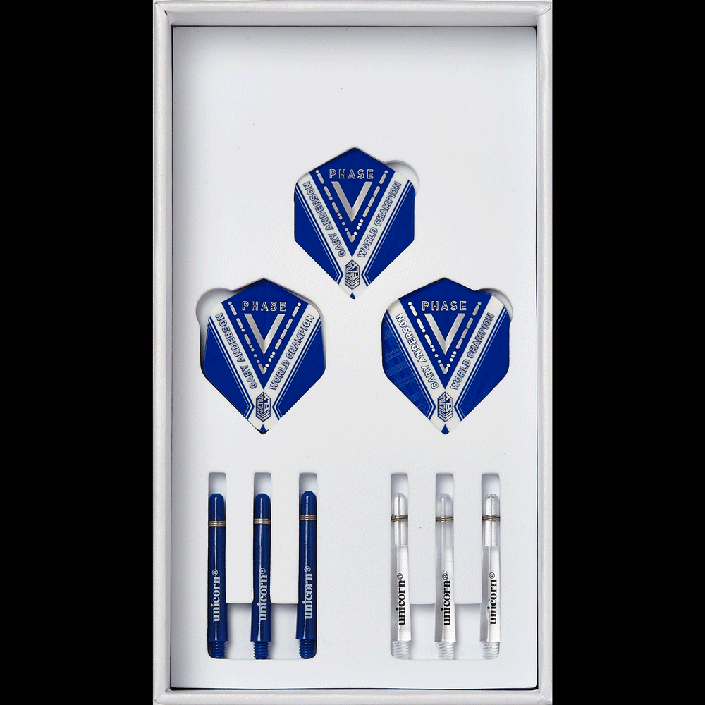 W zestawie znajdują się 3 lotki Gary Anderson Phase 5, 3 komplety shaftów i 3 komplety piórek Ultrafly.