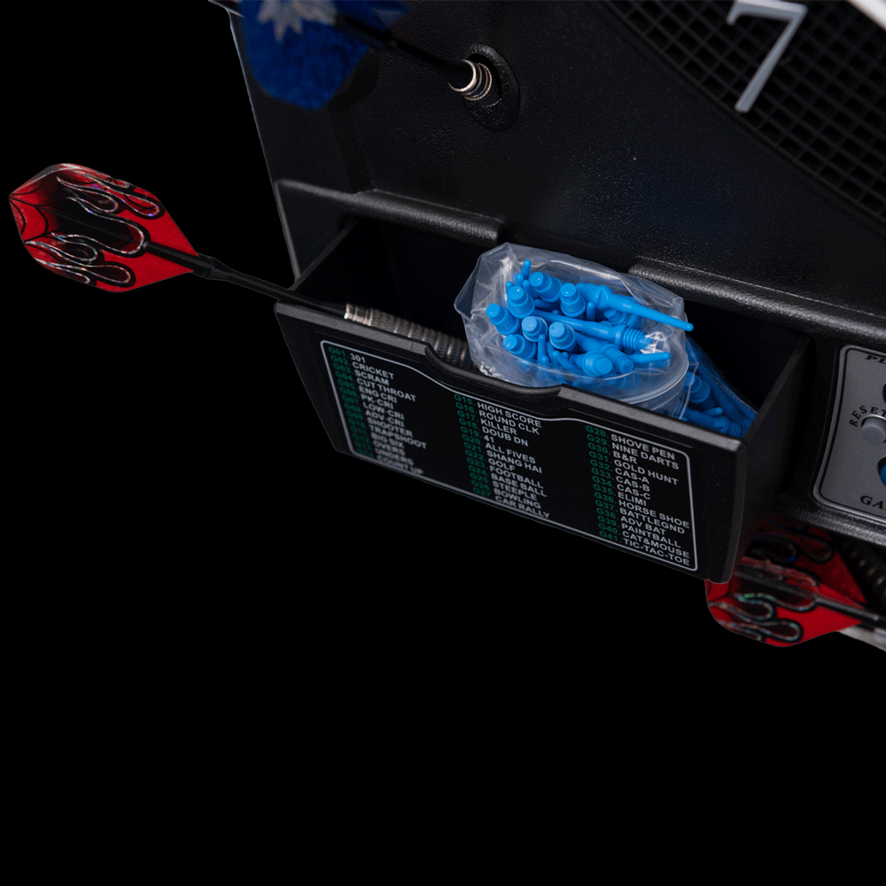 41 gier i 218 wariantów – bogactwo możliwości (301-901, Cricket, No Score Cricket, Scram, Cut-Throat Cricket, English Cricket, Pick It Cricket, Low Pitch Cricket, Advanced Cricket, Shooter, Trap Shoot, Big Six, Overs, Unders, Count-Up, High Score, Round-The-Clock, Killer, Double Down, Forty One, All Fives, Shanghai, Golf, Football, Baseball, Steeplechase, Bowling, Car Rallying, Shove a Penny, Nine Dart Century, Blue V.S. Red, Gold Hunting, Casino-A Flush, Casino-B Straight, Casino-C 3 Star, Elimination, Horseshoes, Battleground, Advanced Battleground, Paintball, Cat and Mouse, Tic-Tac-Toe.). Wszystkie gry opisane w instrukcji (j. angielski i niemiecki).