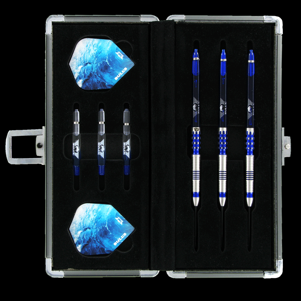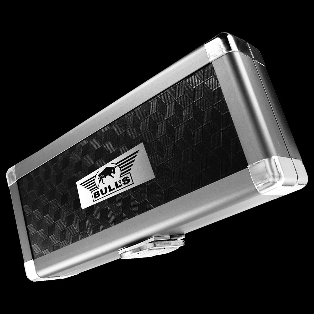 Bardzo eleganckie etui na komplet złożonych lotek. Zewnętrzna czarna powierzchnia pokryta jest wytłaczanym wzorem, który efektownie odbija światło. Wszystkie narożniki zabezpieczone są srebrnym plastikiem. W środku znajdziemy czarną, wytłaczaną piankę z miejscem na 3 lotki (barrel+shaft), wiele piórek i 3 dodatkowe shafty.